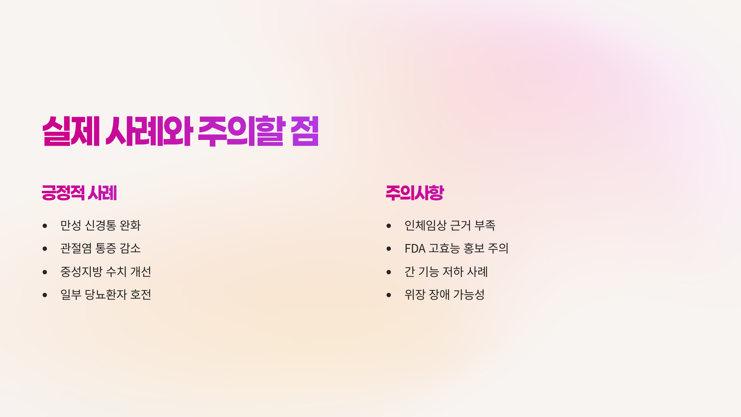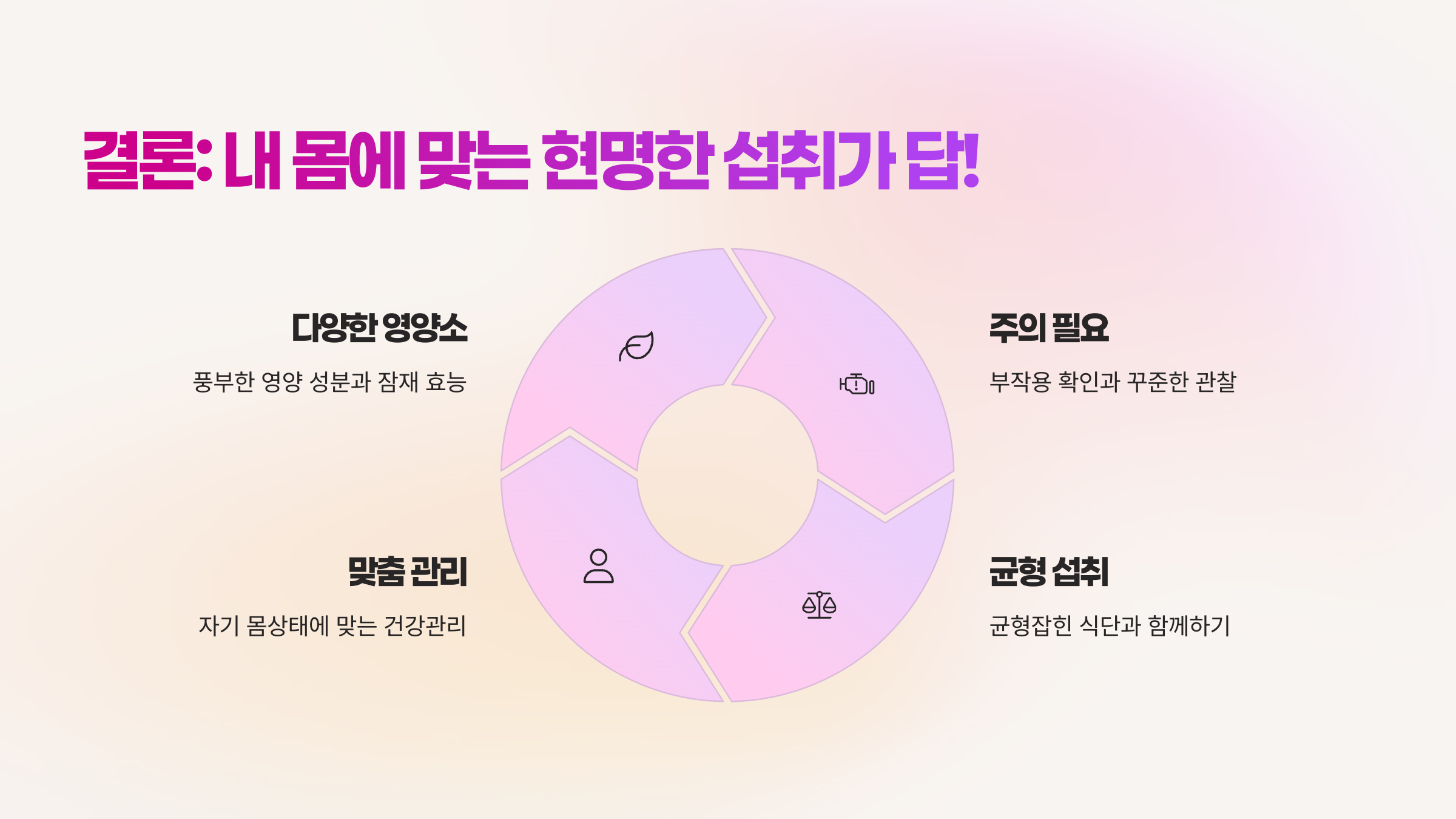 만약 특이 증상이 나타나거나 기존에 질환을 앓고 있다면 전문가와 상담 후 지속적인 섭취 여부를 결정하세요.