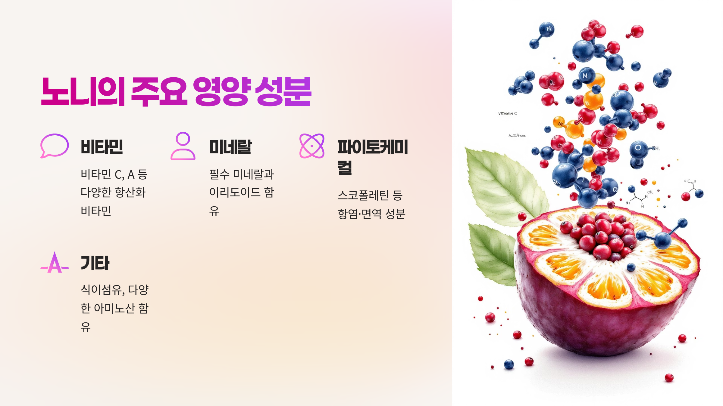 노니 속에는 우리 몸에 유익한 다양한 활성 성분들이 가득합니다. 대표적으로 프로제로닌, 스코폴레틴, 이리도이드, 담나칸탈, 안트라퀴논 등이 있으며, 비타민 C, 비타민 A, 칼륨, 칼슘과 같은 필수 비타민과 미네랄도 풍부하게 함유하고 있습니다.