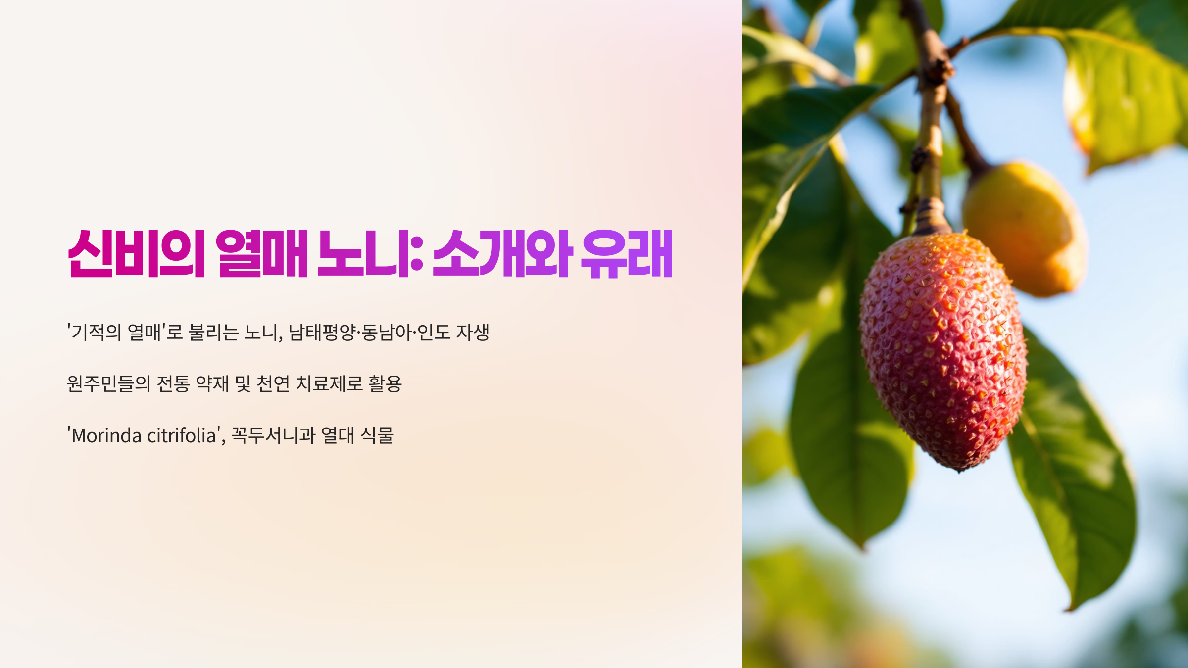 '신이 주신 선물', '기적의 열매' 등으로 불리는 노니. 최근 건강에 대한 관심이 높아지면서 많은 분들이 주목하는 식품입니다. 남태평양 지역에서 수천 년 동안 전통 약재로 사용되어 온 노니에는 과연 어떤 비밀이 숨겨져 있을까요?